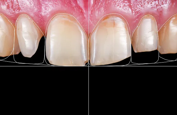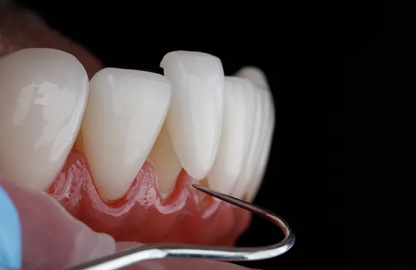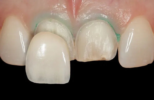 歯の表面をごく薄く削り、セラミック製の薄いシェルを貼り付ける方法です。