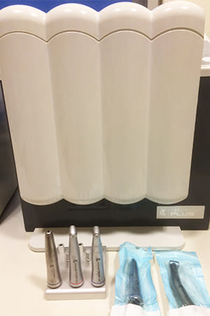 ハンドピース自動注油機器で、診療器具に付くタンパク質など汚れを洗浄し注油する機器です。患者様ごとに診療器具を洗浄し、安心して治療を受けていただける診療環境を整えています。