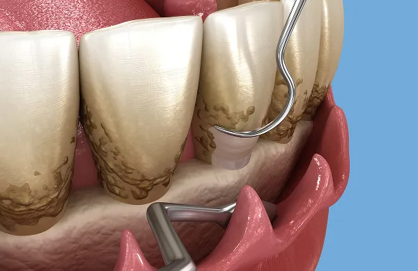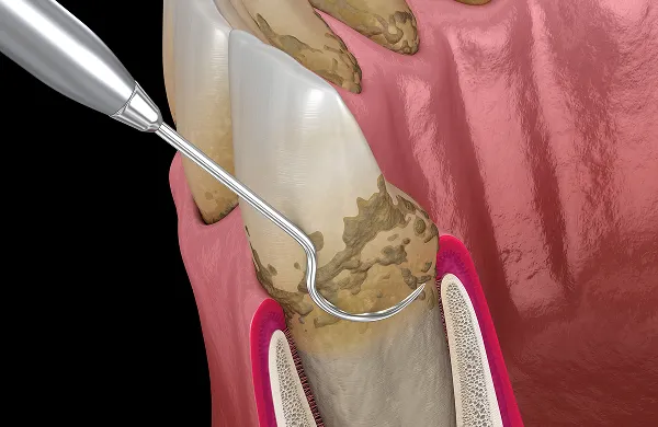 歯周ポケット内部の歯石や細菌を取り除き、歯根の表面を滑らかに整えて再付着を防ぎます。